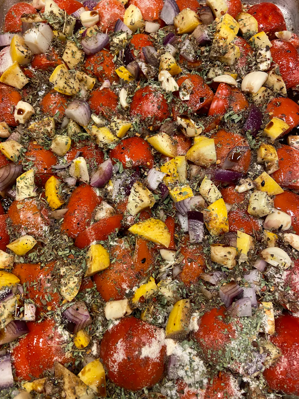 So, I diced unpeeled tomatoes, zucchini, onion, garlic, and peppers. Tossed them with olive oil, balsamic vinegar, and Italian seasoning. Poured onto a rimmed baking sheet, and baked at 325F for 60 minutes, and then tossed